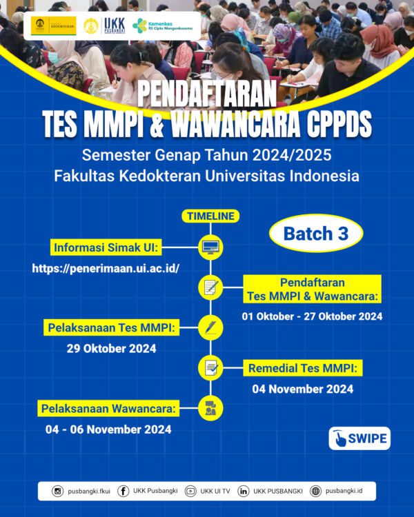Pendaftaran TES MMPI & WAWANCARA CPPDS Semester Genap 2024/2025 Batch 3 resmi DIBUKA! Yuk, segera daftarkan dirimu sebelum kuota penuh!